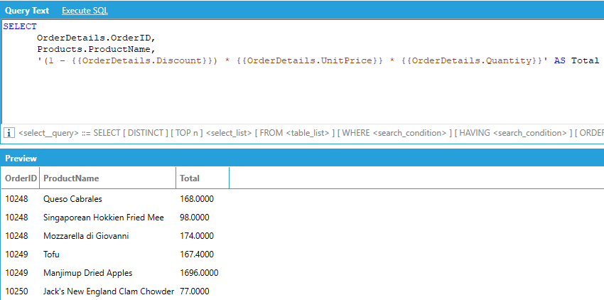 AnalytiX-BI supports column expressions, which are dynamically evaluated when the query is executed. Expressions must be enclosed in single quotes and have an alias that specifies the output column name. Any column names in the expression must be wrapped in double curly-brackets.