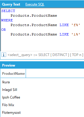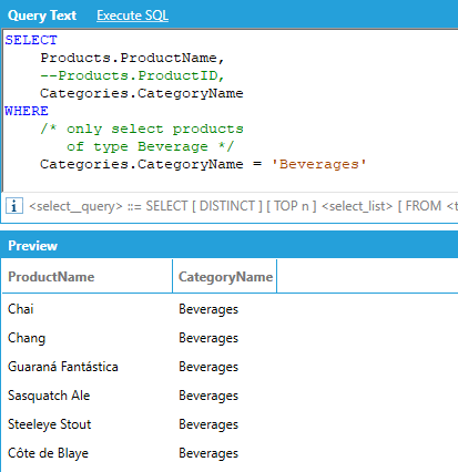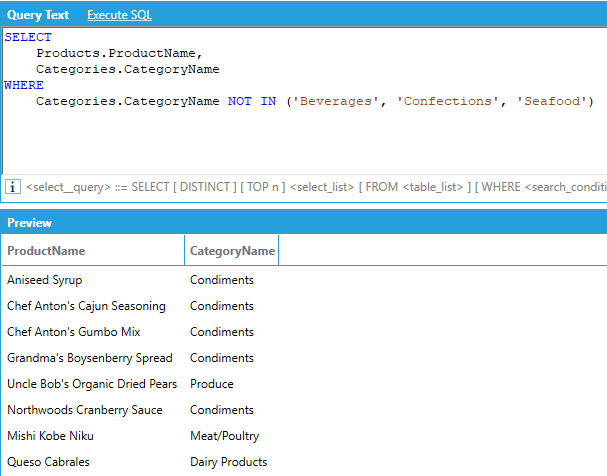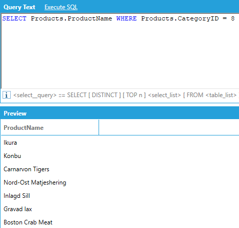 For example, we can return the name of all products for which the Category ID is 8 (Seafood):