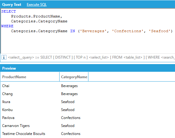 Categories.CategoryName IN ('Beverages', 'Condiments', 'Seafood')