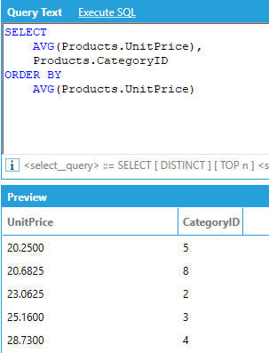 If we want to calculate the same average grouped by category name, we use the query below. The query automatically groups by CategoryName because it does not have an aggregate.