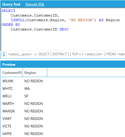 AnalytiX-BI supports the ISNULL function in the SELECT part of the query to replace NULL values occurring in the column with a default value: