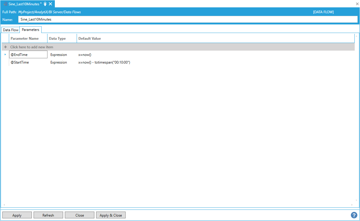 Note: As discussed in the Data Flow Parameters section, parameters of type Expression (in this case, StartTime and EndTime) are not added automatically to the data flow point name.