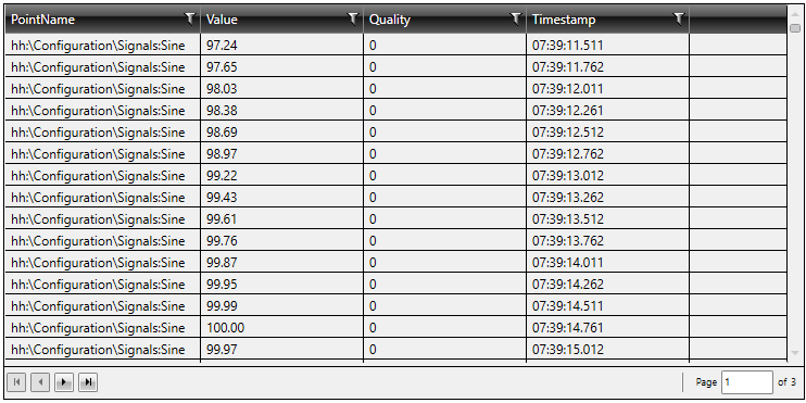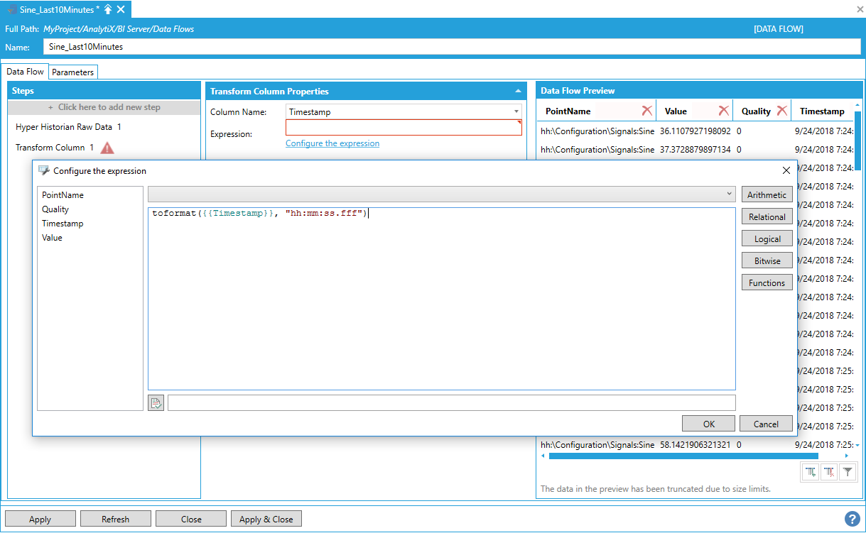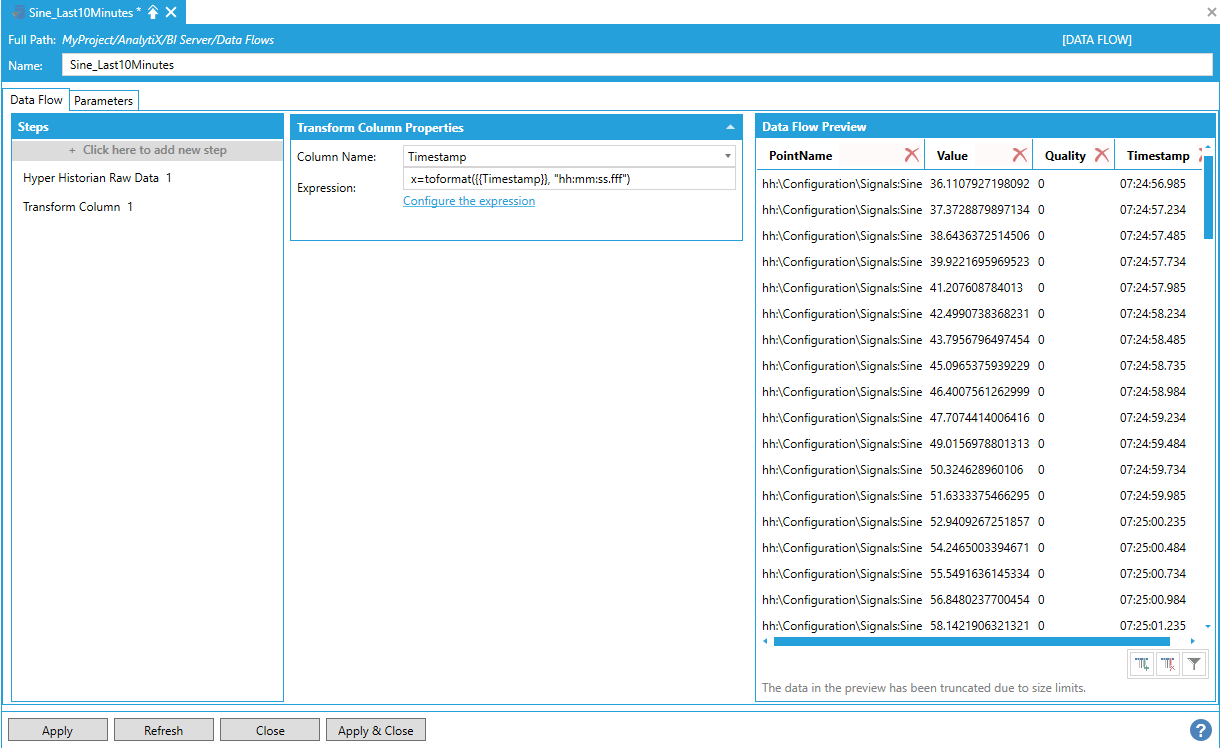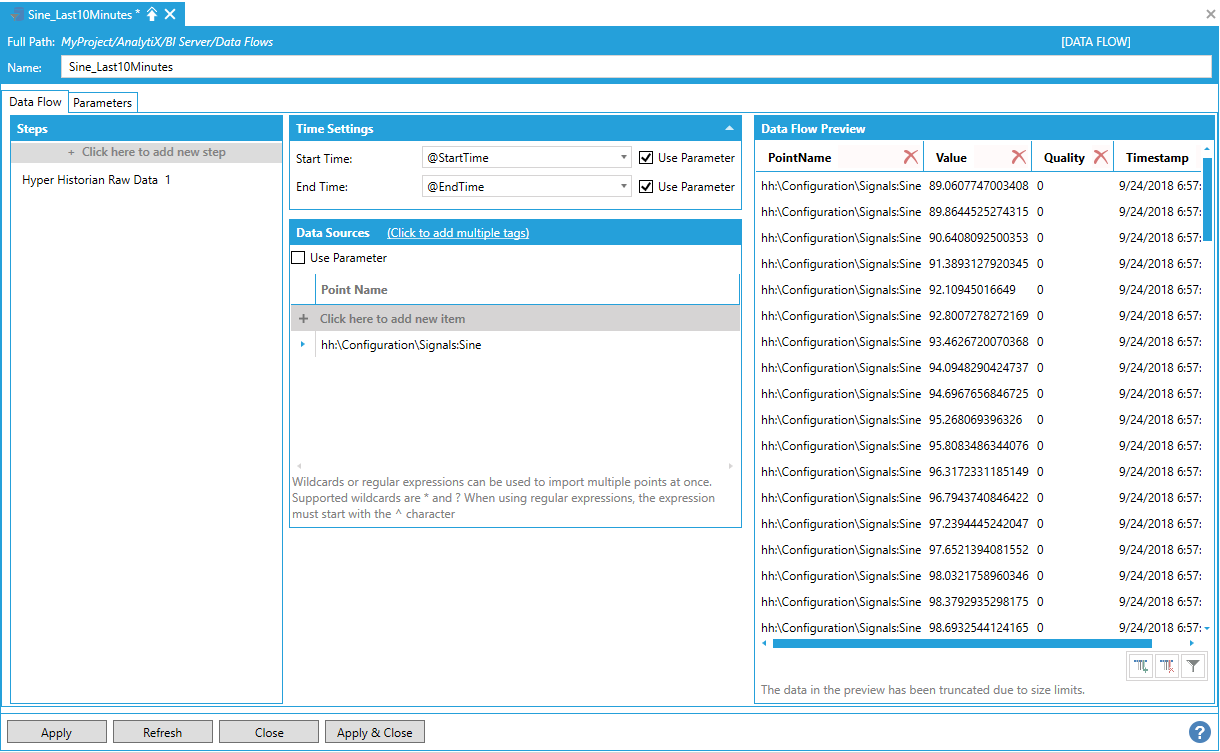 Consider, for example, the following data flow where we are reading raw historical data for the default Sine signal configured in Hyper Historian. The window of the historical read is dynamically configured to the last 10 minutes using data flow parameters.