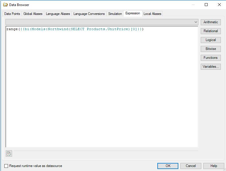 Individual columns in a dataset are exposed as arrays, and can be consumed so from clients like GraphWorX64. For example, assume we want to run the range function (which is not part of the AnalytiX-BI query language) on the UnitPrice column from the Products table. In GraphWorX64, we can create an expression that references the UnitPrice column as an array and applies the range function to it: