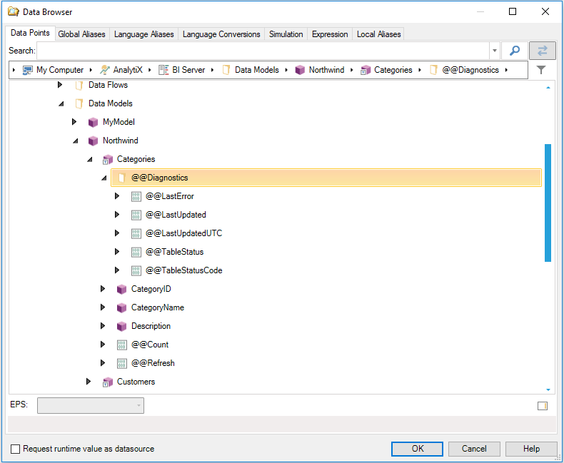 For example, let’s assume that we want to retrieve the ProductName and the UnitPrice from the Products table in the Northwind data model (which is at the root); the resulting point name will be: