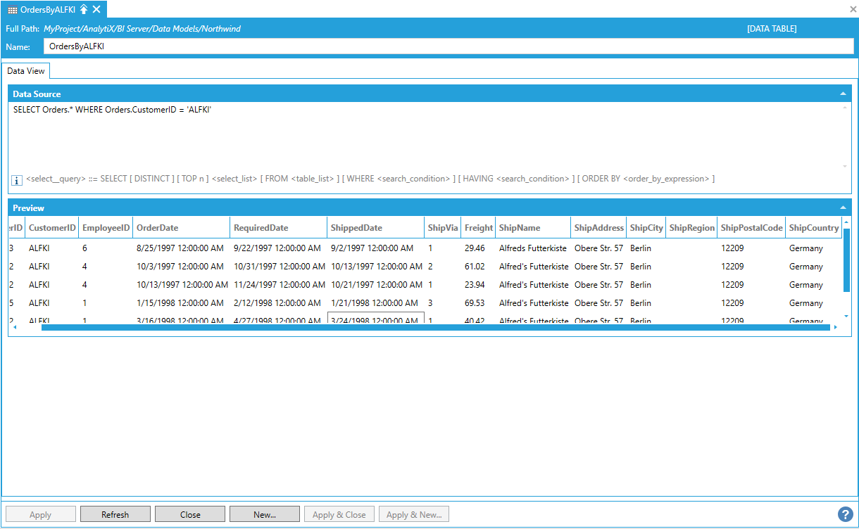 A data view in AnalytiX-BI is essentially a named query, which can then be referenced by name in runtime. For example, we can create a data view in the default Northwind data model to only show orders placed by the customer with ID "ALFKI".