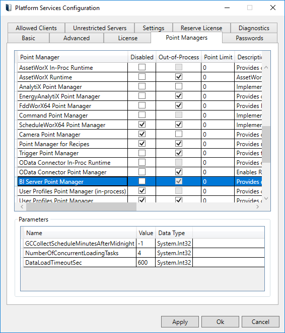 The parameter list shown in the utility however does not contain all the available parameters. Parameters that are not in the list can be manually added to the FwxServers.PointManagers.config file and then modified using the form displayed above.