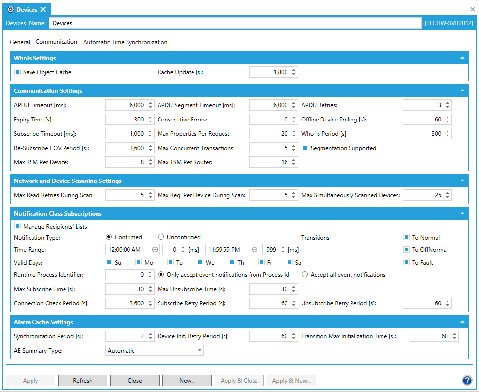 Expire Time [s]: Specifies the time when the unused values are removed from the BACnet cache (in seconds). This should be set large enough to avoid thrashing of the system. For example if a person is paging through graphics the system will be subscribing to object/properties. If he leaves the graphic , if this parameter was set to zero, the BACnet engine would cancel COV subscription to the device if COV, stop polling, and then delete from the subscription cache. If he paged immediately back to the same page then the system would have to re-establish connections to the data, poll it, and re-add to subscribe cache. This should be set high enough, so that object/properties stay in the cache and subscribed until the user session is finished.