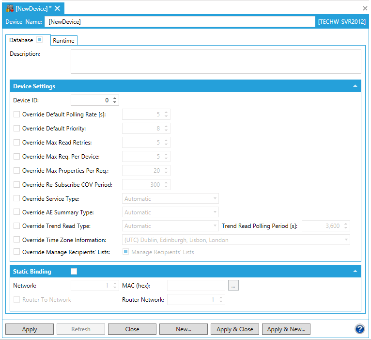 Enter the settings for: APDU Timeout, APDU Segment Timeout, and APDU Retries in the ‘Communication’ tab and Default Polling Rate and Default Priority in the ‘General tab’.