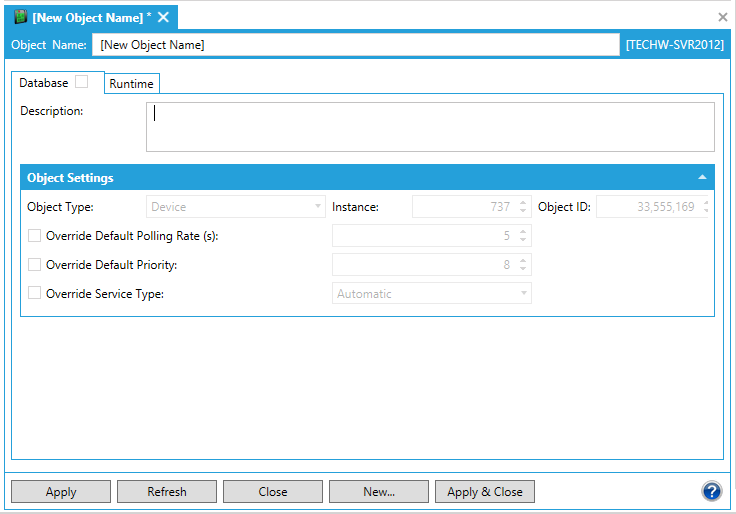 Now, you are going to Create a New Object under your device. Right-click on your Device and select Add Object or Add Object to Database OR click the Add Object or Add Object to Database button in the Edit section of the Home ribbon. A 'Create Object' window may open, requesting you to select the type of object you'd like to create, as well as create an empty object, specify an instance and/or specify a name. If this occurs, make your selections, then click OK. If not, the Object properties will display.