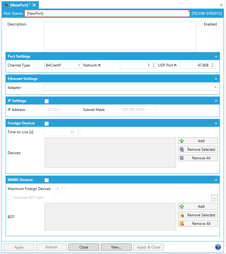 NOTE: Default BACnet communication is based on IP protocol, where the default port (47808) can be changed (under Ports) if you really need it to be, but, in most cases, you can use the default settings. Also notice that Ports in the Workbench are ICONICS proprietary interfaces created specifically for BACnet communication, where the IP port is not equal to a Workbench port.