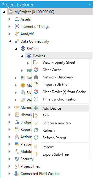 Expand the BACnet node, right-click on the Devices branch and click on Add Device, as shown below.