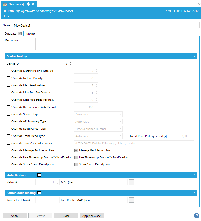 Static Binding – Clicking this checkbox prevents the device entry from being updated (recompiled) independently of this application. This is currently necessary for two-way communication with MS/TP slaves and certain other devices. Once the box is checked off, you can enter the Network and MAC ID numbers.