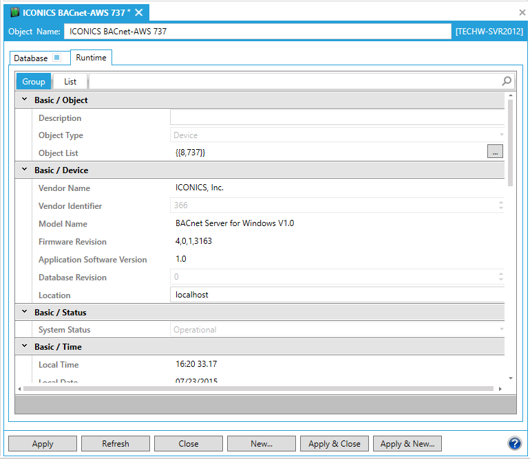 The Runtime tab of the Device properties provides multiple additional properties that can be configured via either the Group or List tab. The following descriptions are from the Group tab, but each individual property can also be found via the List tab, as well.