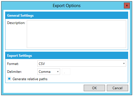 The Export Options window appears, at which point you can decide in which format you would like the data to be exported (CSV, Microsoft Excel or XML), as well as set the Delimiter. You can also opt to Generate relative paths.