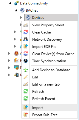 Expand the BACnet node. Right-click on whichever node into which you wish to import. This can be the database, network, Device, Port or Object level of the BACnet provider. Select Import from the pulldown menu, as shown below.
