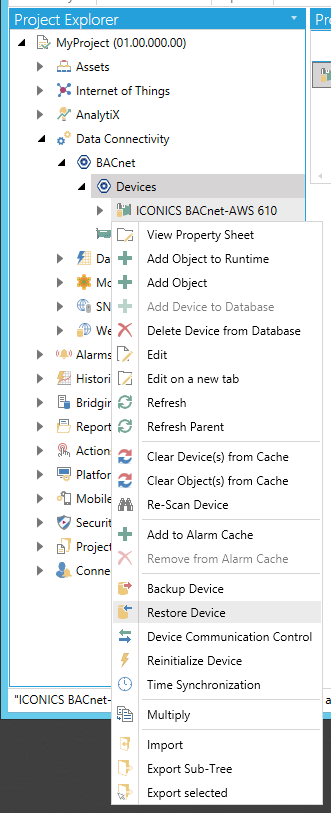 Expand the BACnet node and then the Devices node. Right-click on the device you wish to restore, then click on Restore Device, as shown below.