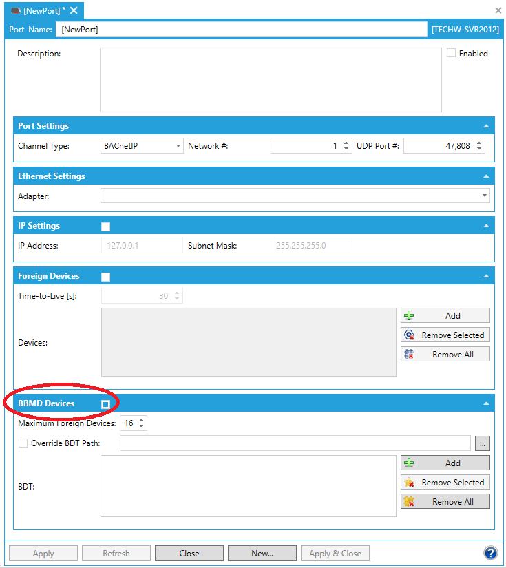 Right-click on Ports and choose Add Port or click the button from the toolbar and select Add Port. The BACnet Port settings will come up.