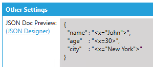 The Generic JSON Writer activity can build a JSON string and write it to a document. Using a simple content designer, the block can write simple scalar nodes, complex object nodes, and array nodes. The values for these nodes can come from previous activities, tags, or expressions.