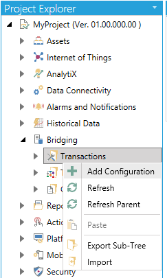Open the Workbench and expand your project, then the Bridging node. Right-click on the Transactions node, then click on Add Configuration, as shown below.