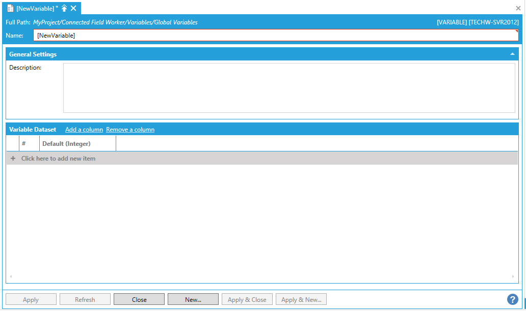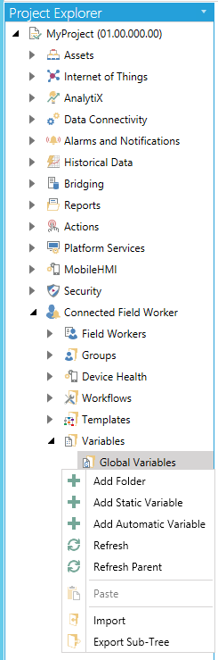 Open the Workbench and expand your project, then the Connected Field Worker node, then the Variables node. Right-click on the Global Variables node. You will have the option of creating either a Static Variable or an Automatic Variable, as shown below. You could also choose to create a separate variable folder at this point.