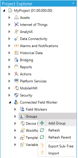 Select the Field Workers branch in the Project Explorer then click on the Add Group button, shown below, in the Edit section of the Home ribbon in the Workbench.