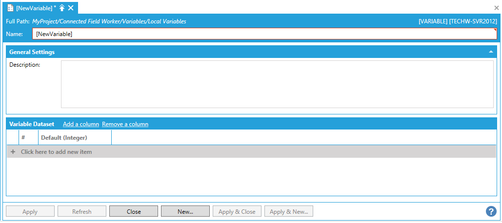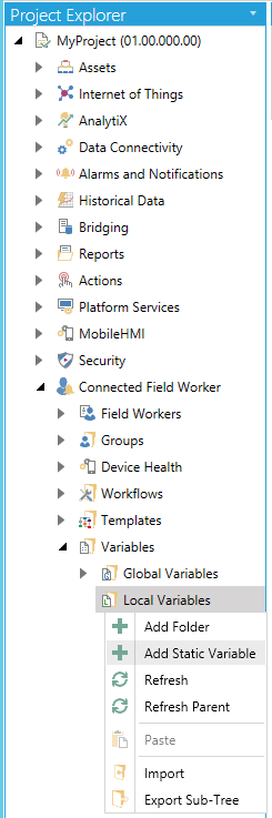 Open the Workbench and expand your project, then the Connected Field Worker node, then the Variables node. Right-click on the Local Variables node then select Add Static Variable. You could also choose to create a separate variable folder at this point.