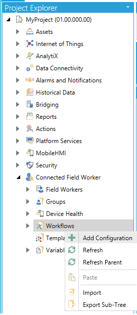 Right-click on a Configuration within the Workflows node, then select Add Workflow from the pulldown menu, as shown below.