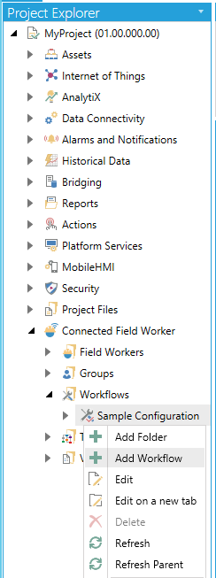 Expand your project in the Workbench, then expand the Connected Field Worker node, then expand the Workflows node. The next steps will require that you have already created a Workflow Configuration via the steps above.