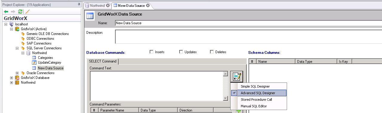 GridWorX provides a SQL Command Designer to help you create an advanced query for your selected database.