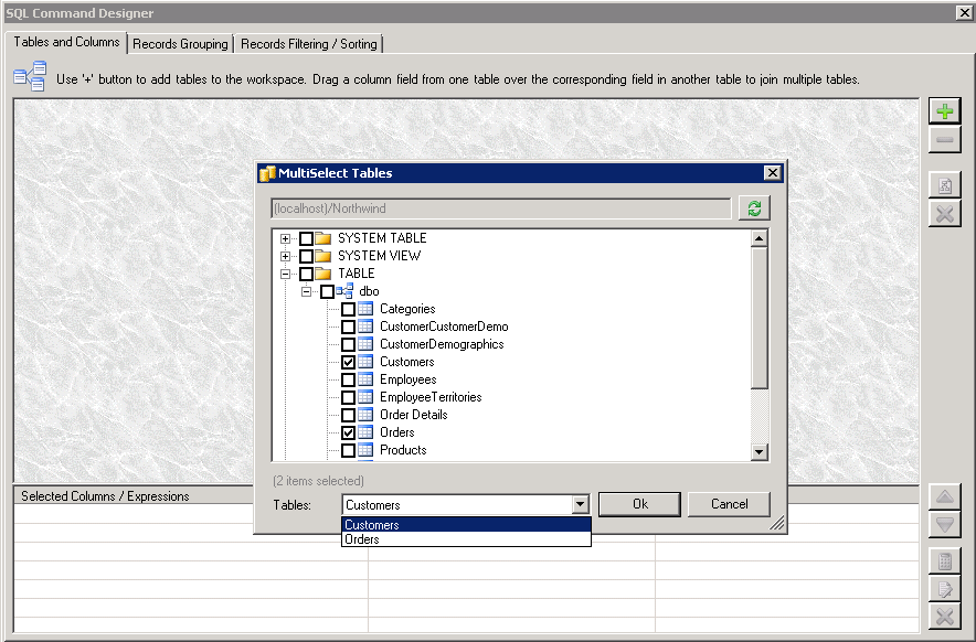 SQL Command Designer with MultiSelect Tables Dialog Box