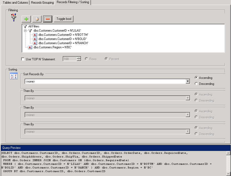 Once you have created all of your filters, you can drag and drop them from one tree node to another, or if you create a new filter while some other filter is selected on the tree, the newly created one will be shown as a child tree node. The tree-like structure for filters displays how they are combined, using AND/OR Boolean operators and parentheses. The rule is simple; each filter node is first combined with its “children,” and then the resulting expression is combined with the “siblings.” Try dragging and dropping several filters onto one another and watch how the SQL preview changes to get an idea of how this works. Click the Toggle Bool button to switch between the AND/OR boolean operators.