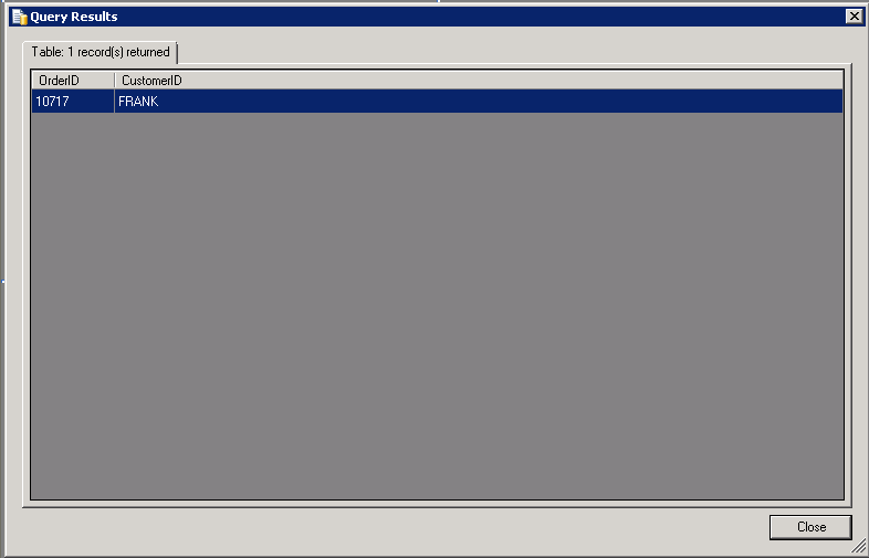 The Query Results dialog box appears and lists valid records retrieved using the parameter values you provided for the query. You may need to test of change your query if you do not see the results you expected. Click Close to close this dialog box.