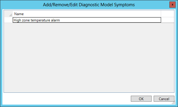 A symptom, in the case of FDDWorX, is any state or condition related to specific equipment that the user/manager would consider cause for concern or "alarm". The symptoms to be added to the Fault Symptoms/Causes Diagnostics Matrix will, of course, vary by connected equipment. For instance, using our example of a VAV Box (a Variable Air Volume unit or zone-level flow control in a heating, ventilating, and/or air-conditioning [HVAC] system), there could multiple symptoms that could cause specific alarms, including (but not limited to): high airflow, high discharge temperature, high zone temperature, low airflow, low discharge temperature, low zone temperature, and/or unstable airflow.