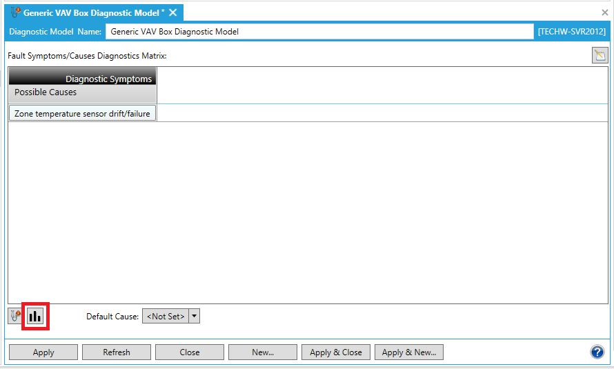 In order to save the changed status of the Fault Symptoms/Causes Diagnostics Matrix (with the newly edited cause[s]), you must then either click on the "Apply" button at the bottom of the Diagnostic Model panel (and can then proceed to make additional changes to the same Diagnostic Model) OR click on "Apply & Close" to save your settings and return to the main Project Explorer OR click on "Refresh" to update the Matrix itself OR click on "Reset" to return the state of the Matrix to the last saved settings OR click on "Add New..." to change the settings for an additional new Diagnostic Model.