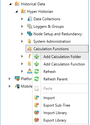 2. Right-click the Calculation Functions node in the navigation tree, or any of its sub-nodes, and select Add Calculation Folder, as shown in the figure below.