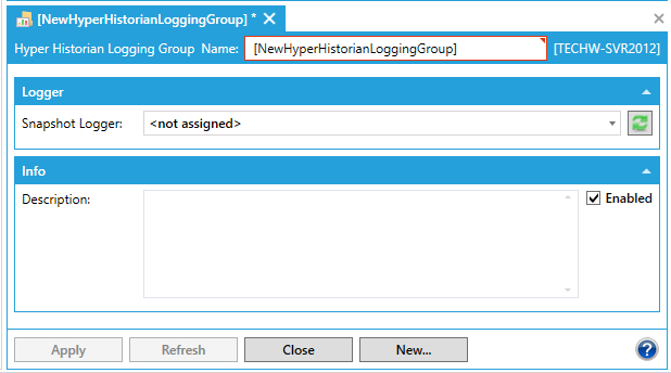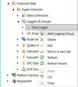 A Logging Group establishes a groups of parameters for collecting samples. Once you have established a logging group, you can set up collector groups of Hyper Historian tags, calculated tags, and aggregate tags.