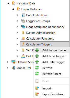 Right-click the Calculation Triggers node in the navigation tree, or any of its sub-nodes, and select Add Trigger Folder, as shown in the figure below.