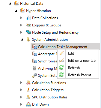 Expand the System Administration node in the navigation tree and right-click on the Calculation Tasks Management node, as shown below, then click on Edit or Edit on a new tab.
