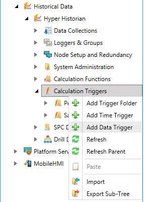 Start the Workbench, then expand your project. Next, expand the Historical Data node to show the Hyper Historian node. Expand the Hyper Historian node to show the Calculation Triggers node.