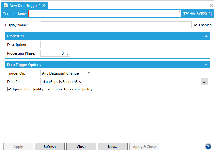 When you add a data trigger to a calculated tag, the tag's calculations fire when the value of a data point equals a specified value or condition. For example, it can fire when a machine switch gets set to on, or TRUE. A calculated tag can have any number of triggers associated with it, but a trigger must be enabled in order to fire. If it is not enabled, it won't fire.