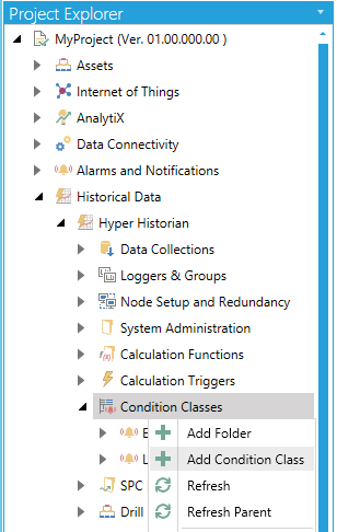 Right-click on the Condition Classes node (or on a contained Condition Class folder), then click on Add Condition Class, as shown below.