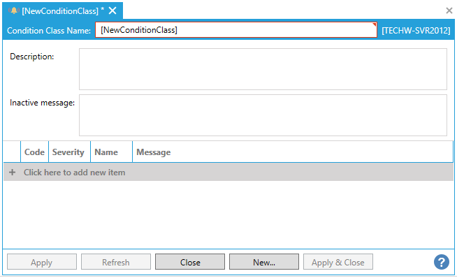 Once you have completed editing items within the Condition Class properties, click Apply to save them and Close to return to the Workbench. Your newly created Condition Class will now appear in the Project Explorer, beneath the Condition Classes node or beneath any pre-selected Condition Class folder.