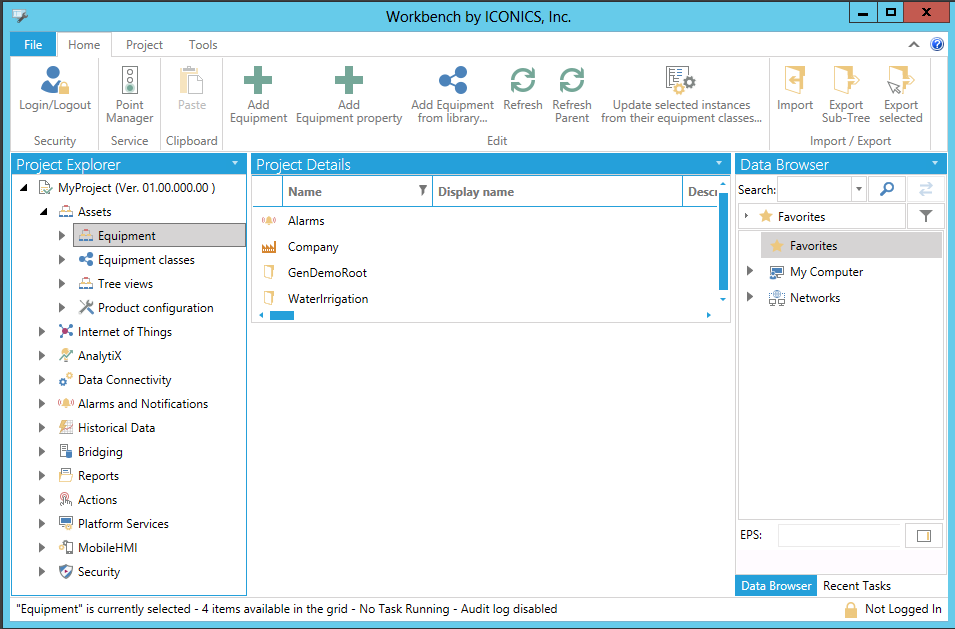 Home Ribbon with Equipment Node Selected in the Asset (AssetWorX) Provider