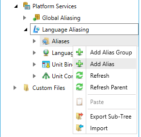 Right-click on Aliases within the Language Aliasing node, then click on Add Alias, as shown below.