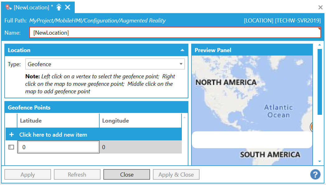 In the Geofence Points section of the window, input a Latitude and Longitude. You can also left-click on a vertex to select the geofence point. Right-click on the map in the Preview Panel to move the geofence point. Middle-click on the map to add a geofence point.
