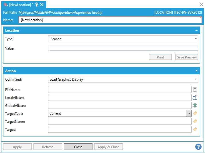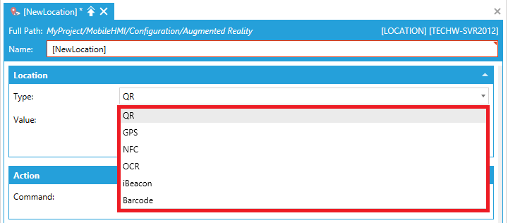 The Augmented Reality feature is intended to provide the user with configurable types of Location Services as well as a configurable Actions dialog. Location Services are a group of MobileHMI features that allow displays to automatically load and display data based on the user's location and proximity to devices.