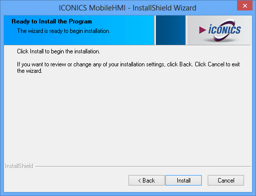 A list of items required for MobileHMI installation appears in the InstallShield Wizard box. These prerequisites will prepare the operating system with any updates necessary to run ICONICS software. Click Install.