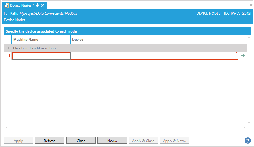 Expand your project in the Workbench and then the Data Connectivity and Modbus nodes. Double-click on the Device Nodes node or right-click it in the Project Explorer, then select Edit, as shown below.