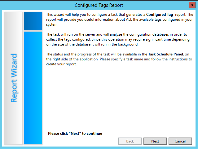 This opens the first screen of the Configured Tags Report Wizard window, as shown below. Upon first use, you can read through the description of the wizard. Click Next to continue.